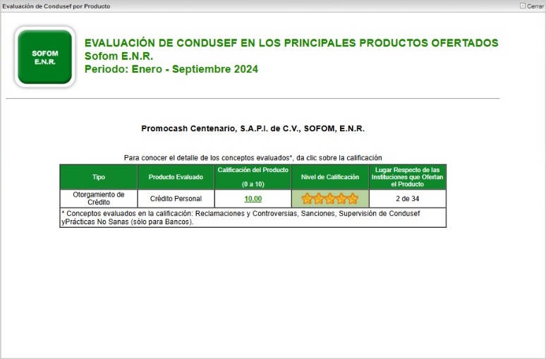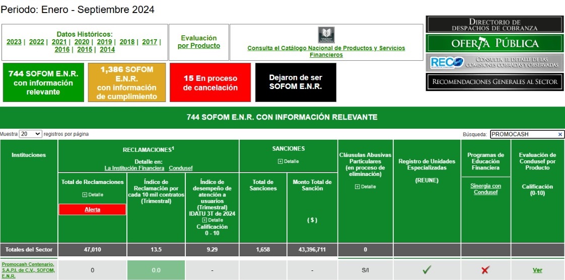 La información corresponde únicamente a Promocash Centenario S.A.P.I. de C.V., SOFOM, E.N.R., para conocer la información de todo el sector, se podrá acceder al sitio: https://www.buro.gob.mx